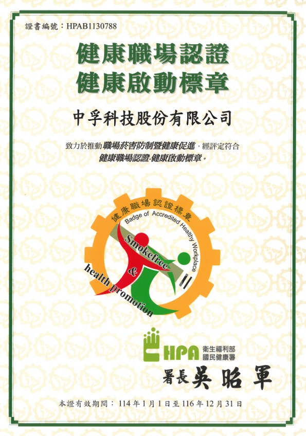 中孚科技致力於推動「職場菸害防制暨健康促進」,積極落實職場無菸及健康促進措施,建立優良之健康工作環境,經衛生福利部國民健康署評定符合「健康職場認證—健康促進標章」,此認證係政府對本公司深耕職場健康、建構友善安全環境的肯定。